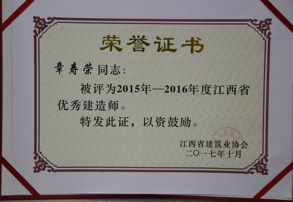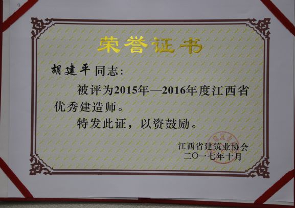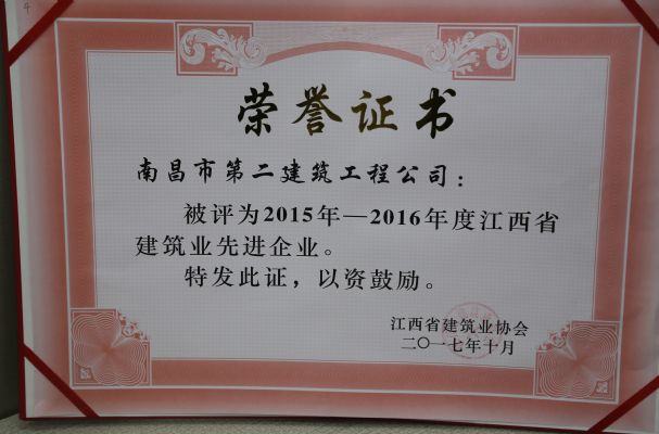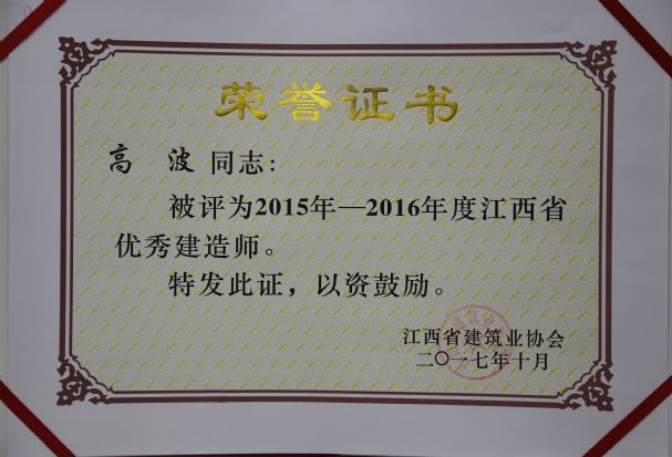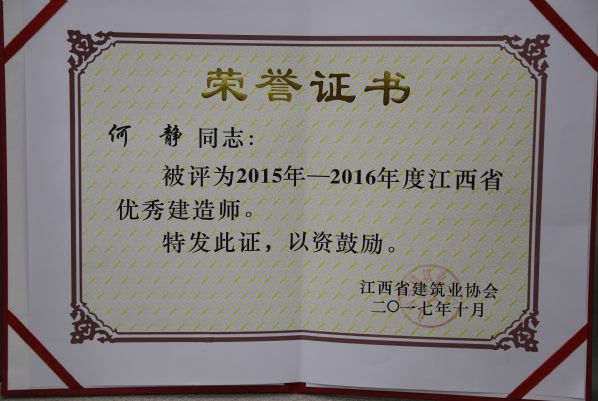 江西省建筑業(yè)協(xié)會(huì)對(duì)公司頒發(fā)了2015-2016年度江西省建筑業(yè)先進(jìn)企業(yè)榮譽(yù)稱(chēng)號(hào),對(duì)公司建造師何靜、胡建平、高波、章壽榮頒發(fā)了2015-2016年度江西省優(yōu)秀建造師榮譽(yù)稱(chēng)號(hào)。
